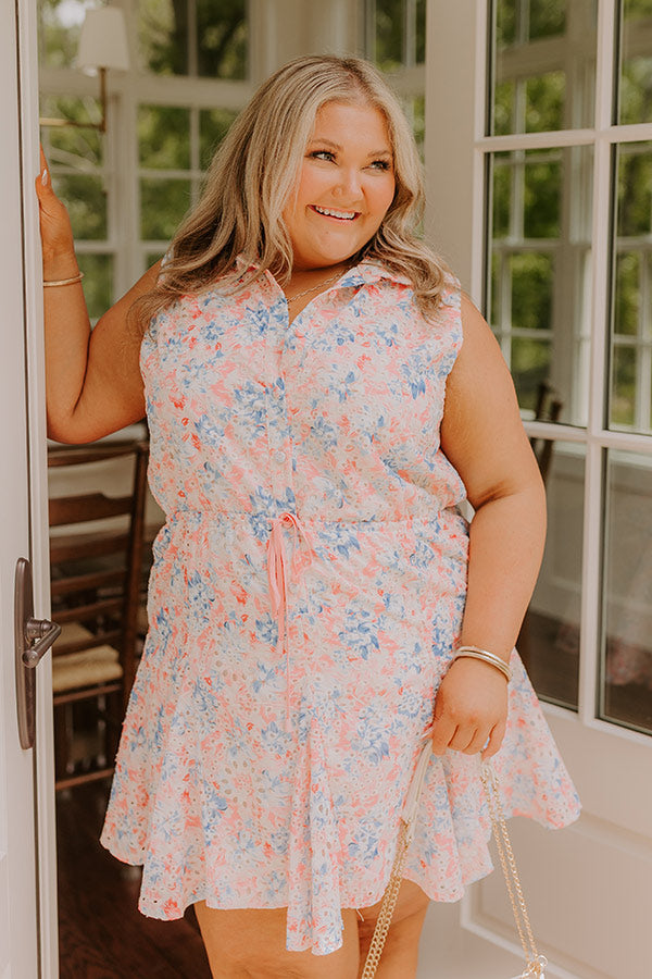 - Get into a vacay state of mind with this adorable mini dress! The adorable floral print and soft eyelet material bring a perfect feminine touch to keep you looking sweet as you stroll into the sunset. - Fully lined eyelet material with an ivory, pink, and blue hued floral print - A collared neckline - A buttoned section ending just below the waistline - A sleeveless cut - A cinched drawstring waistline - Pleated detailing at the skirt - A flattering silhouette that ends in a scalloped mini dress length hemline