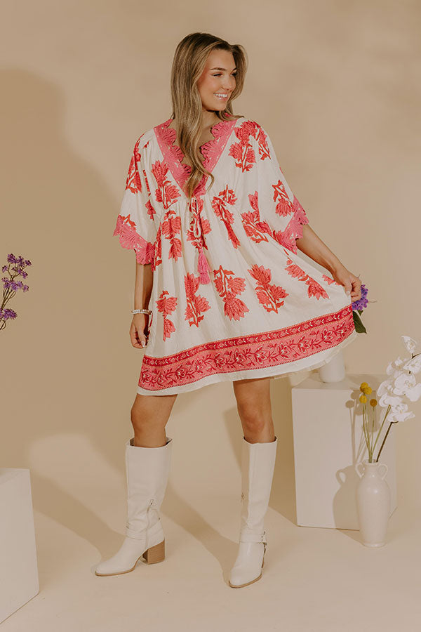 Add a romantic pop of color to your wardrobe with this pink floral mini dress. Designed with delicate lace accents and a soft, feminine silhouette, this style is perfect for effortless everyday outfits with a charming touch. Crafted from fully lined fabric with an abstract floral print, this dress features a flattering V-neckline trimmed with lace and short sleeves for easy coverage. Finished with a sweet bow detail at the waist and hidden side pockets, it blends thoughtful details with an easy-to-wear silhouette. Details: - Fully lined fabric with abstract floral print in pink hues - V-neckline with lace trim - Short sleeves with lace trim - Bow accent at the waistline with coordinating tassel details - Hidden side pockets - Straight mini-length hemline Fit Notes: - True to size - Relaxed, easy fit - Comfortable through the body - Mini length
