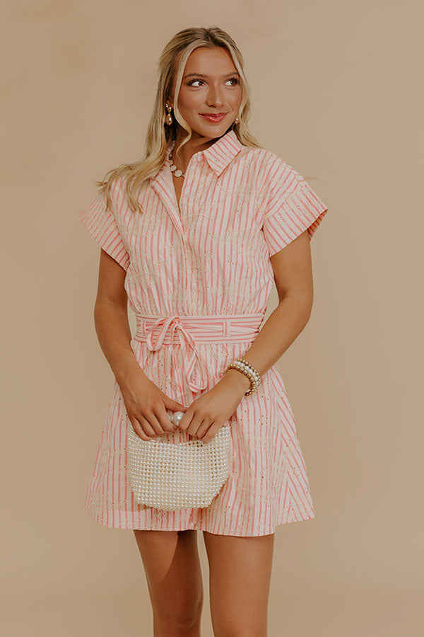 - Step into effortless style with this embroidered mini dress! Its sweet striped design and polished vibe make it a must-have for chic, everyday looks.