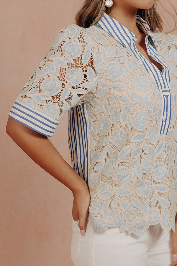 An elevated mix of texture and pattern, this piece blends delicate floral lace with crisp striped accents for a look that feels both fresh and refined. The soft sky blue and cream palette keeps it light and polished, while the contrast details add a modern touch.