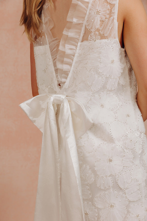 Light, delicate, and beautifully detailed, this dress brings a soft, romantic feel with its floral mesh and subtle beaded accents. The airy texture gives it that elevated finish, while the open back and bow create a standout moment.