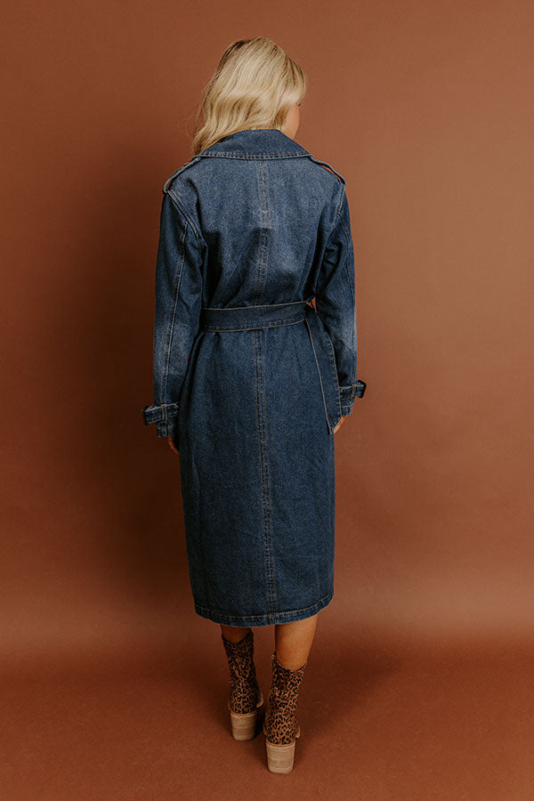 - Strut through your day with this chic trench coat! Its flattering silhouette and timeless denim material make it a stylish pick for effortless layering all season long.