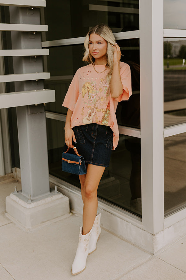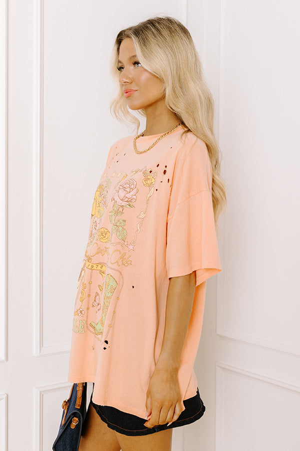 - This country cutie is a trendy must-have! With its darling Nashville themed graphic and distressed detailing, this tee is a total charmer! Unlined 100% cotton with distressed detailing - A 'Country Club Nashville' graphic design on the front featuring brown, yellow, sea glass, french vanilla, and baby pink - A crew cut neckline - Short, loose sleeves - A relaxed silhouette that ends in a straight hemline