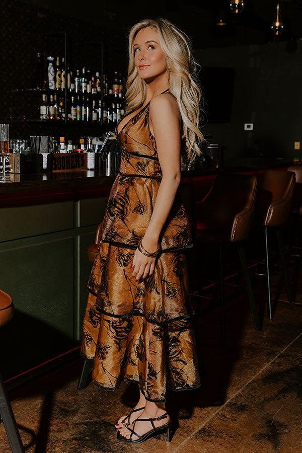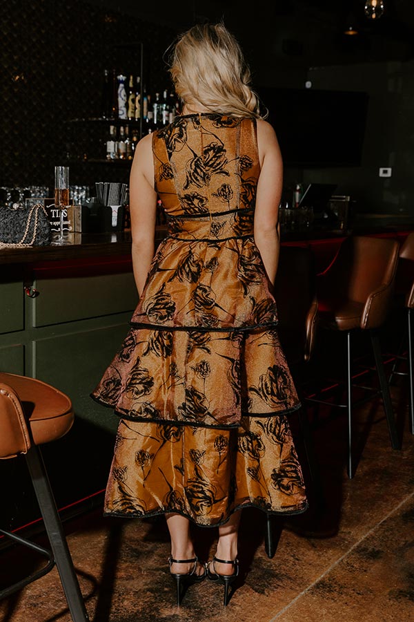 - Dress for all the charming moments with this dreamy tiered midi! Its floral velvet design and soft shimmer create a look that feels instantly elevated.