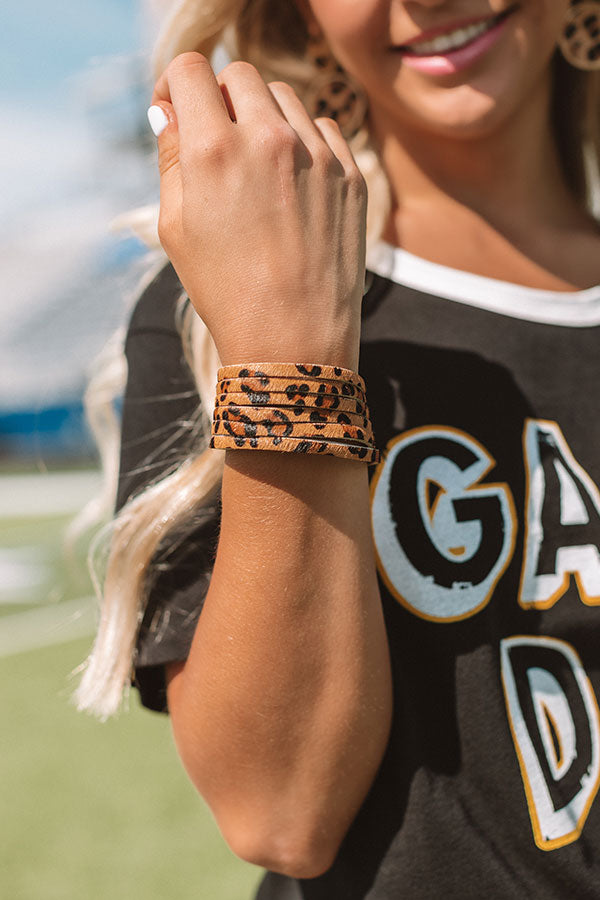 What better way to show off your jewelry style than during game day! This faux leather bracelet looks gorgeous paired with your fave game day tee with its brown leopard straps connected by a two snap closure!