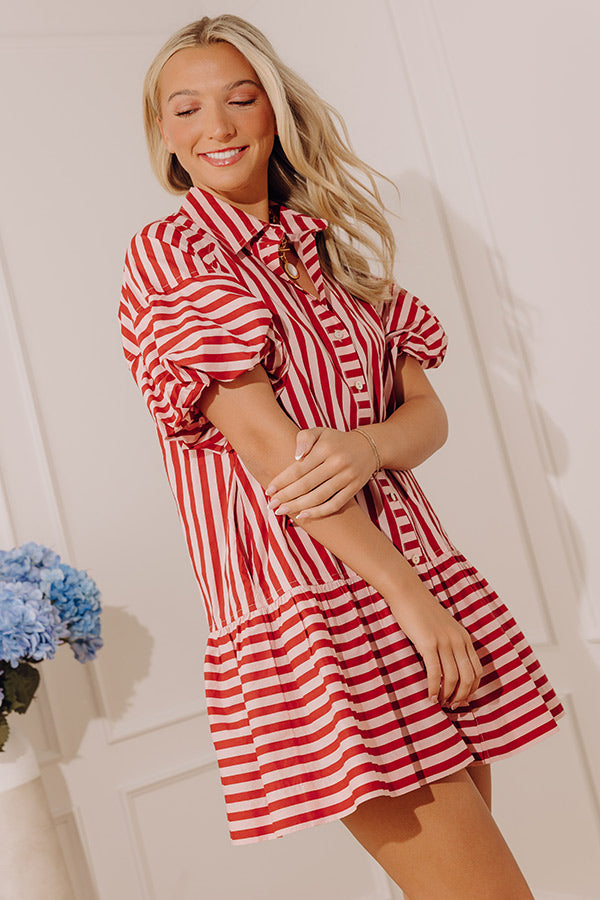 A playful mix of color and detail gives this dress a standout, feminine feel. The rose quartz and crimson stripes create a look that feels bold yet polished.