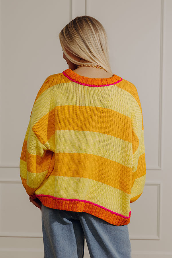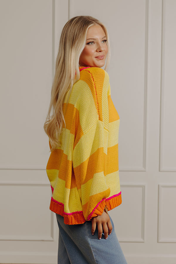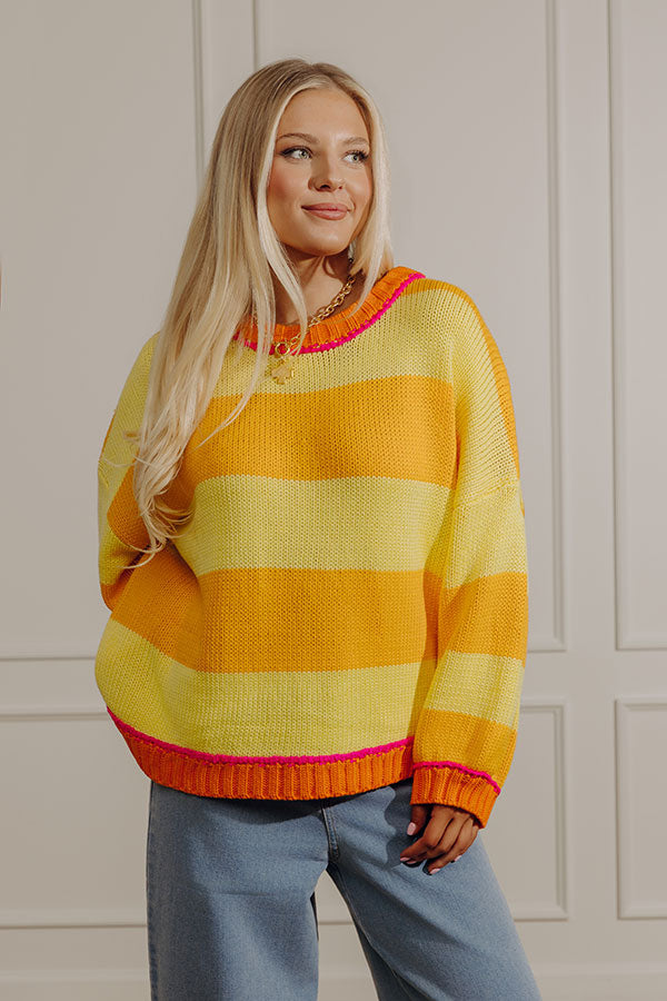 Make a statement in this bold yet refined striped knit, designed for effortless cool with a polished finish. Crafted from a soft, unlined sweater knit, this standout piece features lemon yellow and golden honey stripes balanced with fresh tangerine and hot pink accents for a modern color-blocked effect. A wide ribbed crew neckline and rib-trimmed cuffs add structure, while the intentionally oversized silhouette offers a relaxed, on-trend drape that flatters with ease.