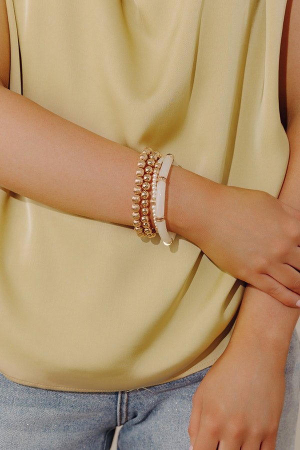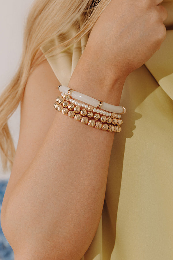 A chic little stack that instantly pulls your look together, this bracelet set mixes textures and tones for an effortless layered feel. The combination of faux pearls, gold accents, and smooth white beads creates a clean, polished look that pairs with everything.