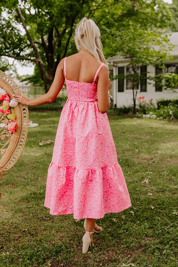 - Meet-up for cosmos with the girls in this gorgeous jacquard midi! With a beautiful floral pattern and a flattering corset style bodice, this cutie is a perfect combo of sweet and chic. Whether you are going for a charming daytime look or a fabulous night under the city lights, this dress will keep your style in the spotlight. - Fully lined floral jacquard material - A ruffled sweetheart cut neckline - Adjustable spaghetti straps - A corset style bodice with structured boning and a smocked back - Back zip closure - A flattering silhouette that ends in a midi length hemline with a side slit accent