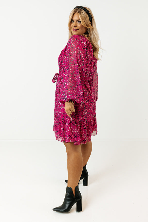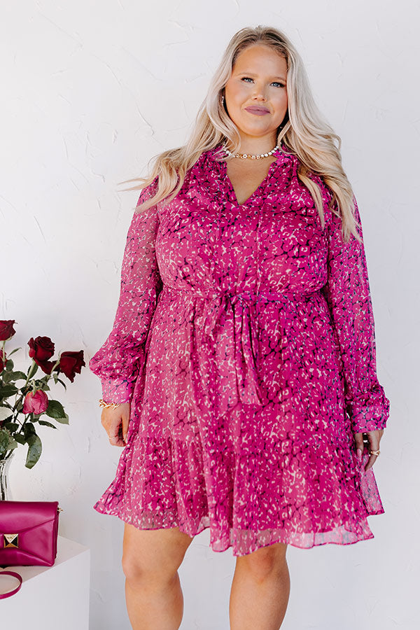 You'll be date night ready in our beautiful 'Perfect Kind Of Love' shift dress! Features a lightweight fuchsia colored chiffon material with animal print pattern and shimmering stripe accents, a soft slip, a round neckline with a tie closure, subtle ruffle detailing, long sheer sleeves with button closure, waistline tie belt, and a flattering silhouette that falls into a straight gathering hemline.