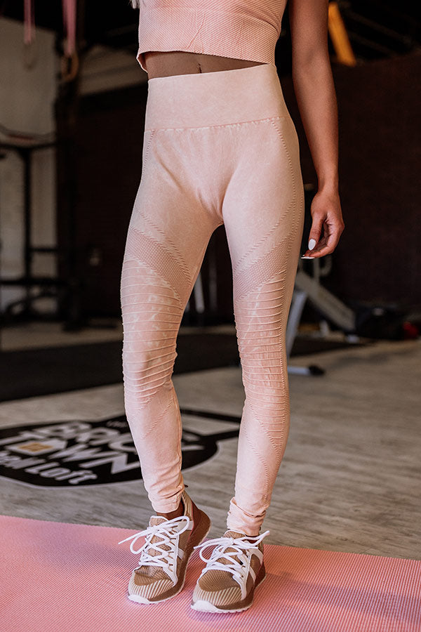 You are sure to set a style record when you arrive in these sporty peach hued moto active leggings featuring lightweight four-way stretch material, subtle diagonal panel accents around the thighs and wide ribbed texturing, a high waistline for tummy control, and a flattering figure hugging silhouette that tapers into fitted ankle-length hemlines!