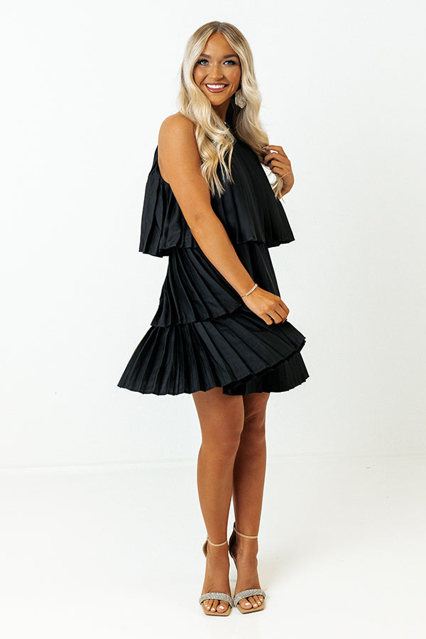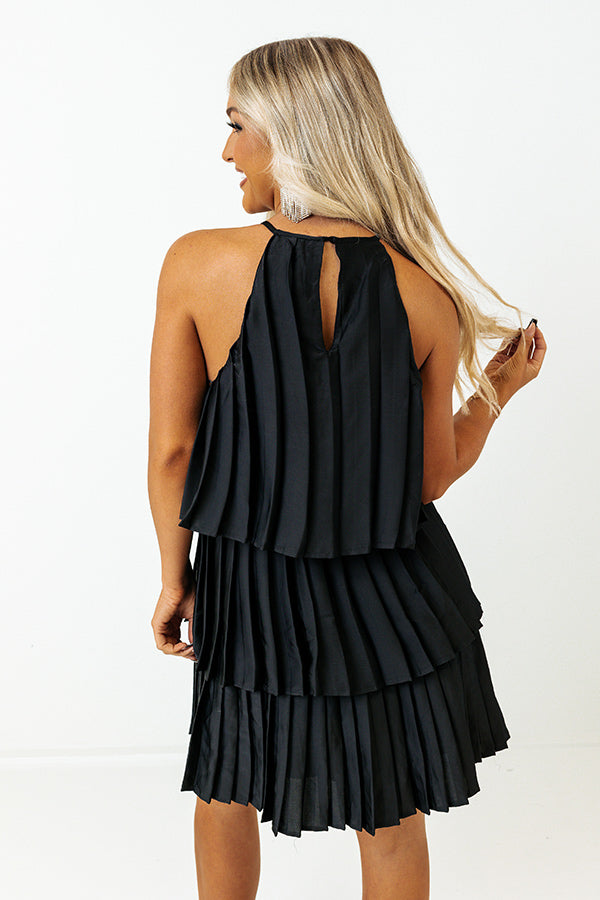 Jaws are sure to drop when you arrive in our stunning black 'Central Avenue' dress featuring sleek lightweight material with pleated texturing, a rounded neckline with sleeveless spaghetti straps, a keyhole accented upper back with a button closure, and a three tiered silhouette that falls into a straight mid-thigh length hemline!