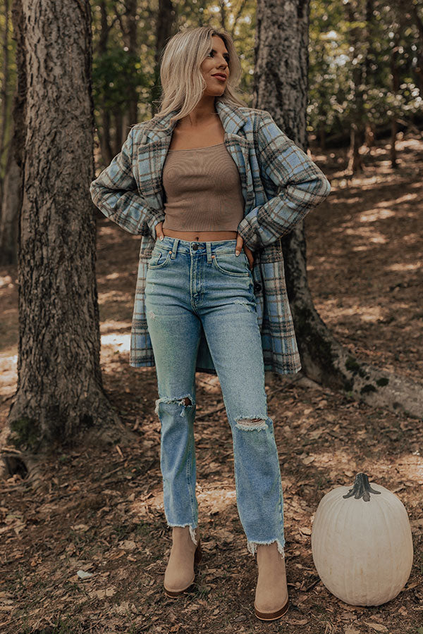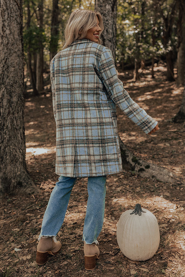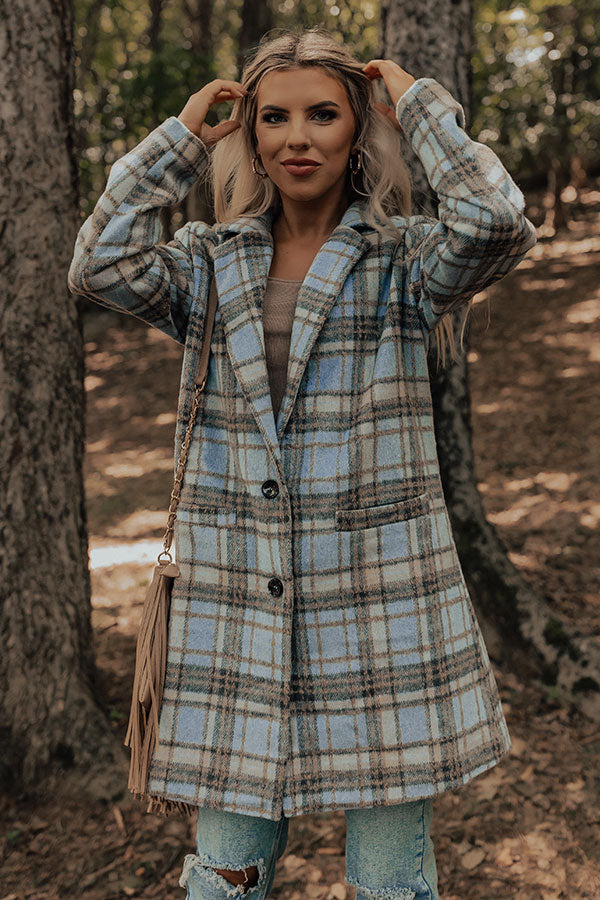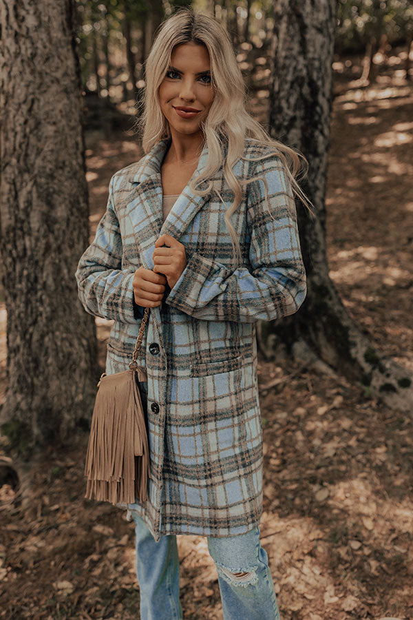 There is no better piece to stay warm in this fall than our pretty 'Craving The Cold' coat featuring warm blue and taupe hued plaid material, long sleeves, a two button front closure with a collared neckline, two low pocket cuts, and a relaxed silhouette that falls into a straight lower-thigh length hemline!