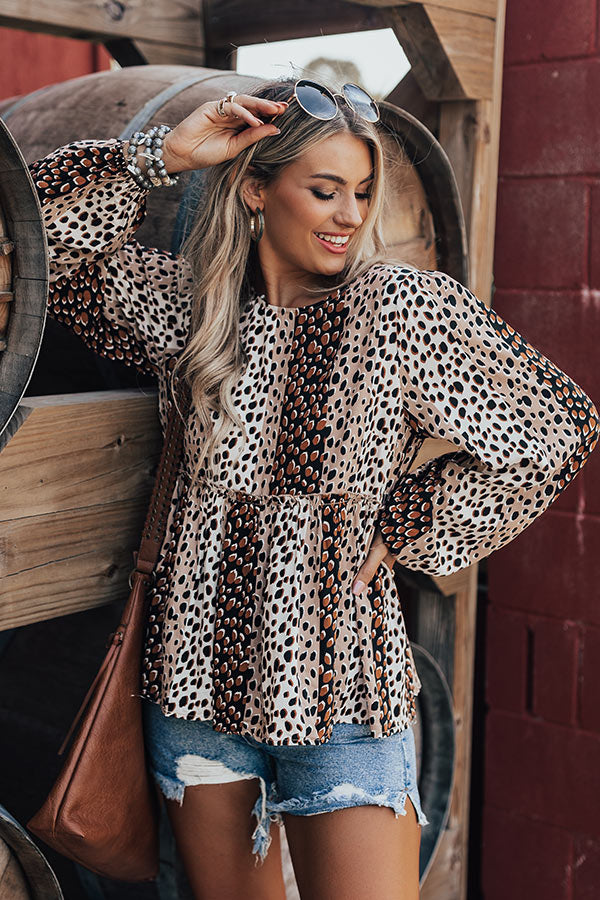 Keep your look carefree with this adorable charming shift top featuring lightweight flowy material, iced latte, white, and brown color bock stripes patterned with a white, brown, and black spotted print, a rounded neckline, long bubble sleeves, and a relaxed peplum silhouette that falls into a straight hemline!