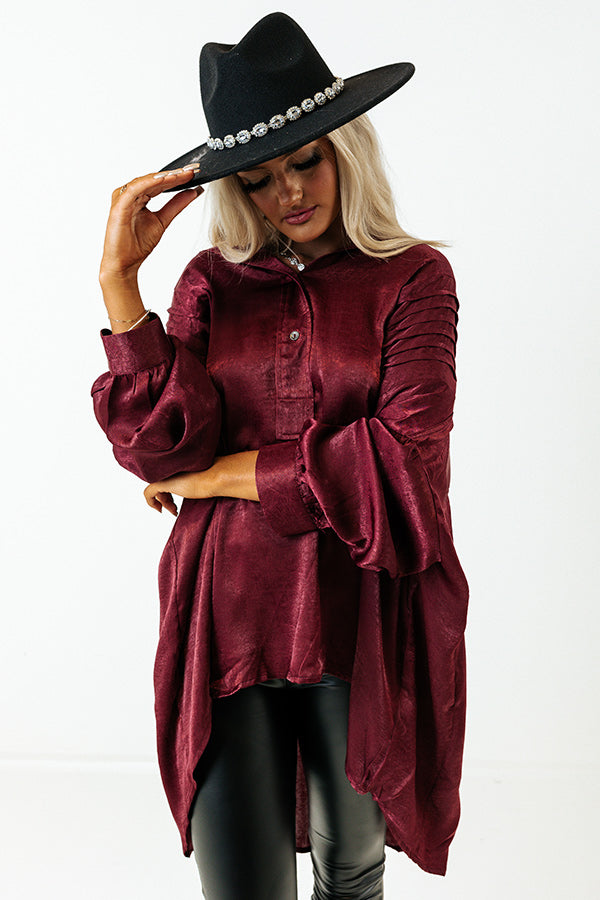 Be office ready and strut towards success in our 'Apple Cider Sips' satin shift top! Features maroon toned lightweight material, round neckline, button up closure, pleating at the shoulders, long loose dolman sleeves with cuffs, gathers on the back, and a relaxed silhouette that falls into a rounded uneven hemline.