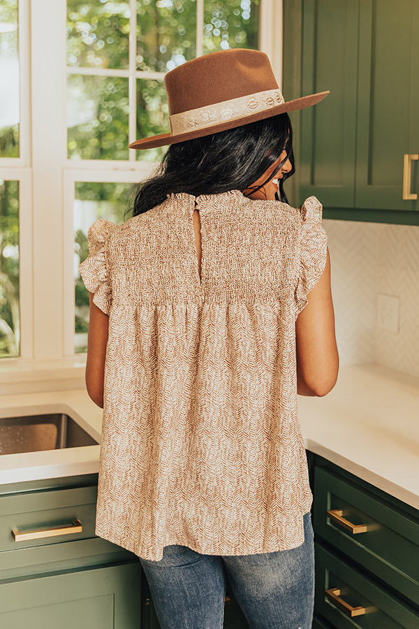 You will be beaming with beauty when you arrive in this charming shift top featuring lightweight material patterned with a small brown zebra print, a smocked bodice with a ruffled neckline, ruffled cap sleeves, a keyhole accented upper back with a button closure, and a relaxed silhouette that falls into a straight hemline!