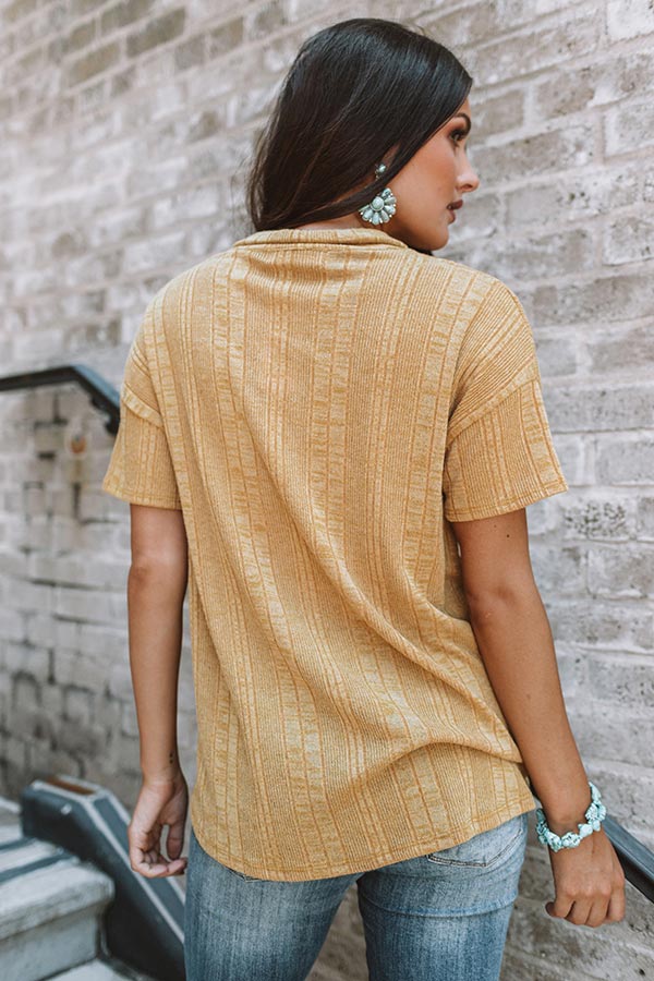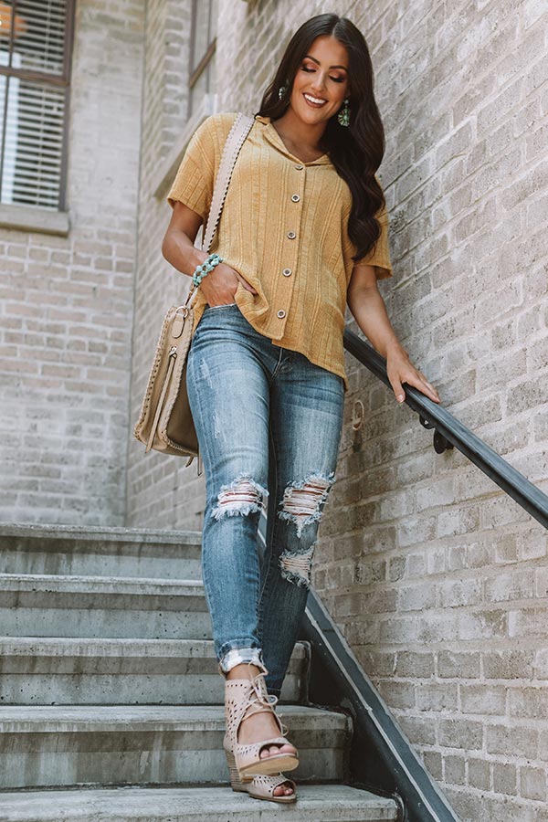 This casual mustard top is sure to be one of your go-to transitional pieces with its button up front, notched collar, short sleeves, relaxed fit, and sweater texture! We have styled this piece with distressed skinnies, statement earrings, and a neutral platform heel and crossbody for a laid back and practical summer look, but for a cute fall look, you can pair this blouse with our black "Blakely High Waist Flares," closed toe wedges, and our "Denver Days Denim Sherpa Lined Jacket in Medium Wash!"