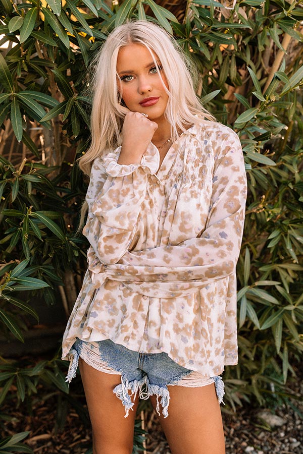 Let your summer style bloom in this beautiful shift top featuring lightweight chiffon material patterned with a mustard hued floral print, a button up front with a tie closure v-cut neckline, long loose sleeves with subtly flared cuffs, and a relaxed silhouette that falls into a straight hemline!