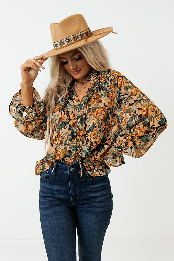 This beautiful top will be the apple of your eye this season! Features teal chiffon material with a floral pattern, high round neckline with ruffles and front tie detail, button down front, long loose sleeves with banded cuffs with ruffle detail, and a relaxed silhouette that falls to a straight hemline.