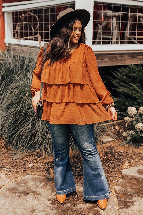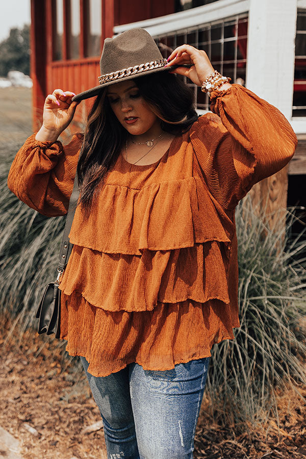 Plus Size - Twirl into fall in style with our darling rust/orange hued 'Coffee Lover' top featuring lightweight flowy material with subtle texturing, a rounded neckline, long bubble sleeves, and a tiered ruffle silhouette that falls into an uneven hemline!