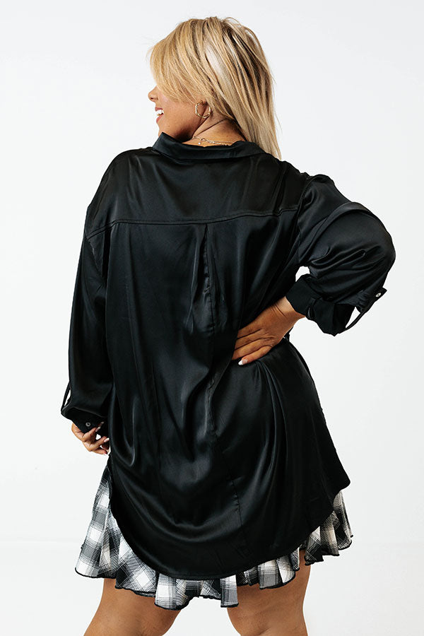 Put your best girl boss foot forward with our chic black plus size 'East Of Everything' top featuring lightweight satin material, a button up front with a collared neckline, long loose sleeves with roll-tab cuffs, and a relaxed silhouette that falls into a rounded hemline!