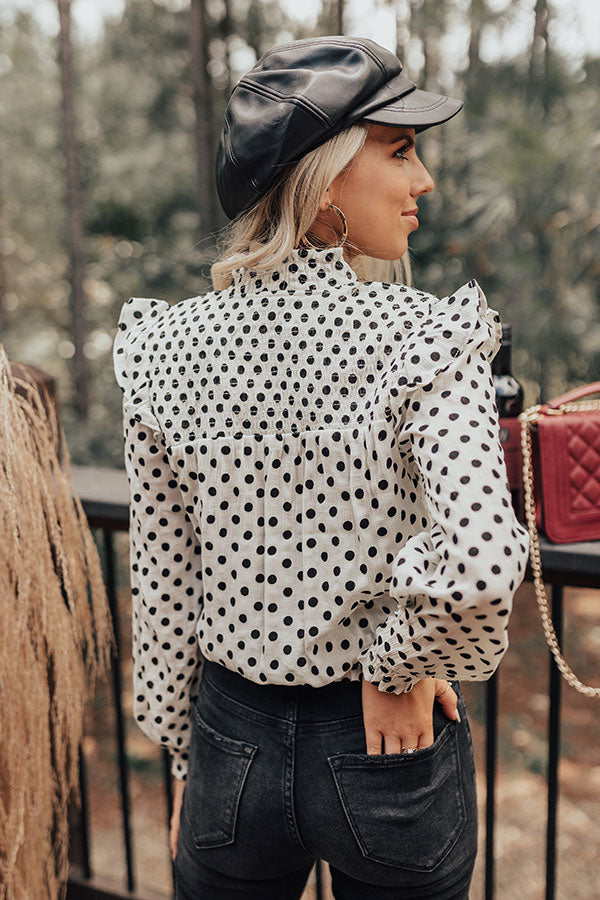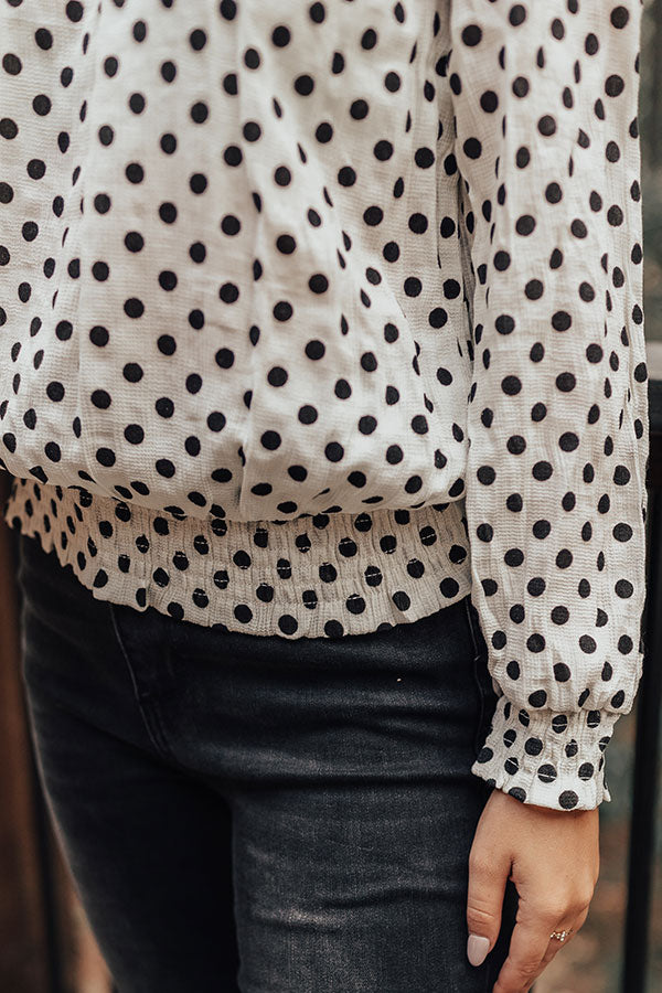 Get dressed to impress in our pretty white 'Espresso In Italy' Top featuring lightweight material patterned with black polka dogs, a high neckline, long bishop sleeves with smocked cuffs and ruffled accent caps on the shoulders, and a relaxed silhouette that ends in a wide smocked hemline!