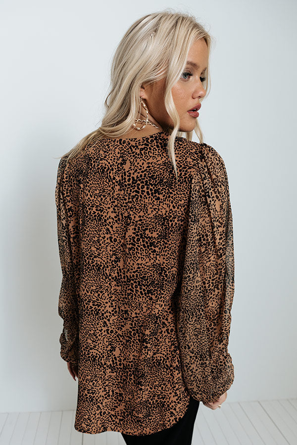 Be a total girl boss in our chic brown 'Full Of Passions' top featuring lightweight material patterned with a small brown leopard print, a v-cut neckline, long bubble sleeves, and a relaxed silhouette that falls into a rounded hemline!