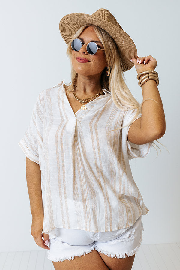 Keep casual this summer in our simple plus size 'Lake Como Shift Top' featuring ultra lightweight material patterned with vertical beige colored stripes, a collared v-cut neckline, short sleeves with roll-ta cuffs, a button down back, and a relaxed silhouette that falls into a rounded hemline!