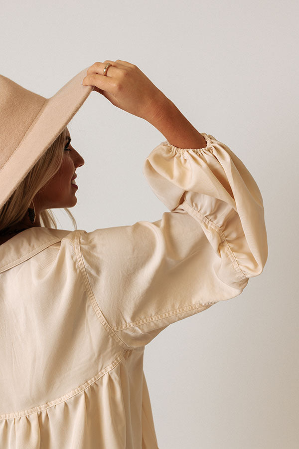 Slay all day in our pretty cream colored 'Luckiest Of All Shift Top' featuring sleek lightweight satin material, a collared v-cut neckline, long oversized sleeves with bubble cuffs, and a flattering babydoll silhouette that falls into an uneven hemline!