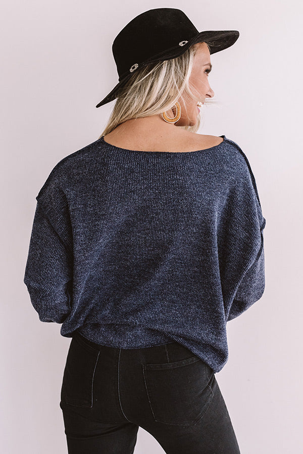 Cozy up for fall in the navy "Once Upon a Dream" shift top featuring soft lightweight tight knit material with ribbed texturing, a rounded neckline with a scooped v-neck cutout, long oversized sleeves with rolled cuffs, exposed accent seams, and a relaxed silhouette that falls into a straight hemline! We have styled this piece front tucked into some distressed black flares, a faux suede hat, and a neutral fringe crossbody, but you can also wear it with some frayed ankle skinnies, "The Kendra Ankle Bootie in Snake Print," and our "Times Square Kisses Snake Print Tote in Grey!"