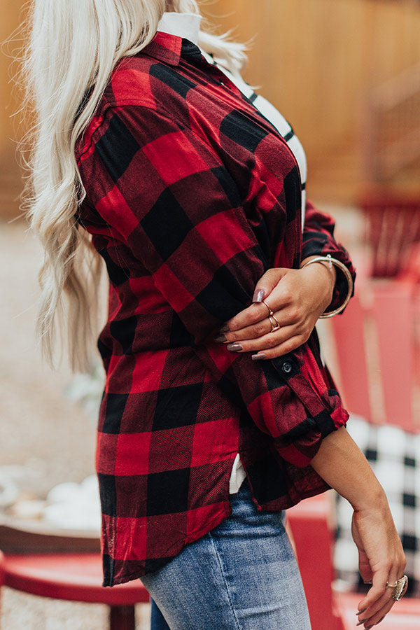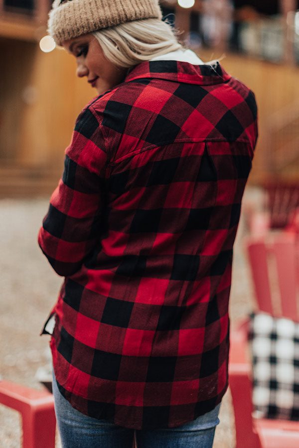 Get ready for pumpkin spice and everything nice in this flirty top featuring soft lightweight material patterned with a black and crimson plaid print, long loose sleeves with roll tab cuffs, a button down front with a collared neckline, a single accent chest pocket, and a relaxed silhouette that falls into a rounded hemline!