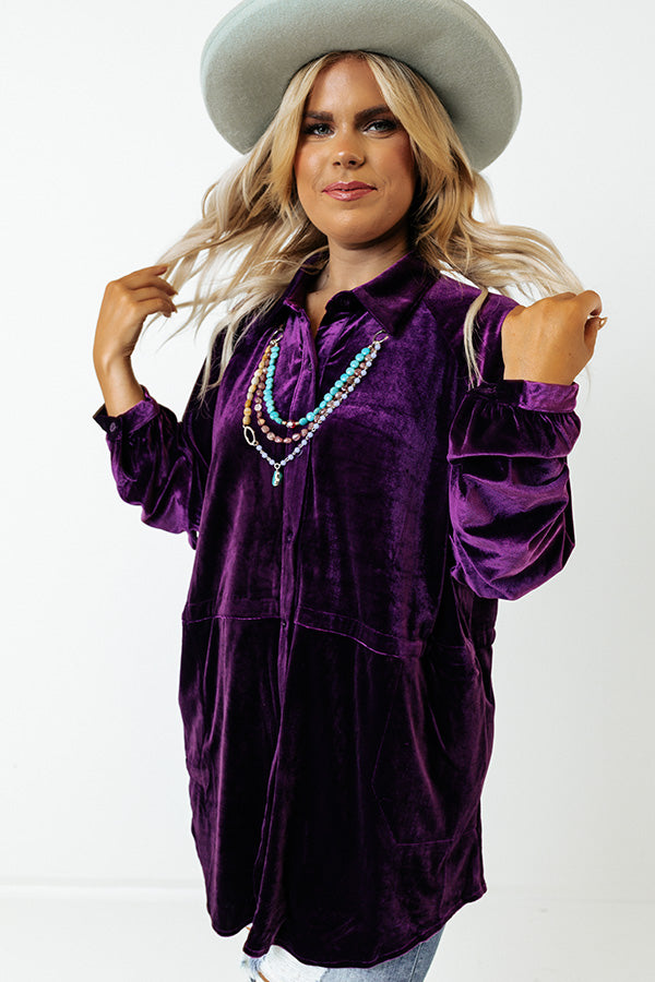 Fall is in the air! Layer up in luxury with our 'Apple Cider Sips' velvet jacket featuring soft, lightweight purple colored velvet, collar, button up closure, two large side pockets, long loose sleeves with button cuffs, and a loose fit that falls to a rounded front hemline.