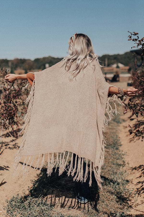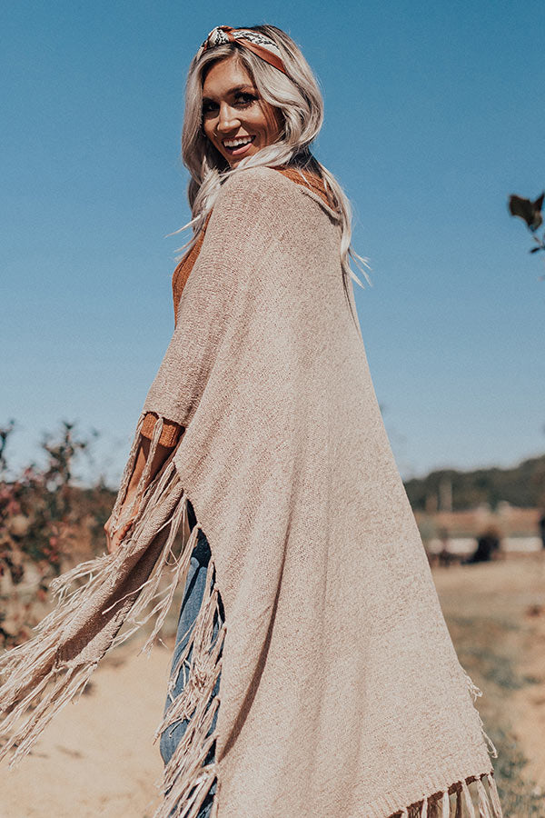 Stay warm and protected from that chilly "Aspen air" with this adorable neutral hued poncho featuring soft lightweight tight knit material, loose draped half sleeves, intricate fringed edge detailing, and a relaxed open front silhouette that falls into an uneven knee length hemline! You can style this versatile piece with just about anything from a basic tank to a sweater, jeans to skirts or dresses, booties to wedges or sandals, clutches to totes, and hats to earrings!