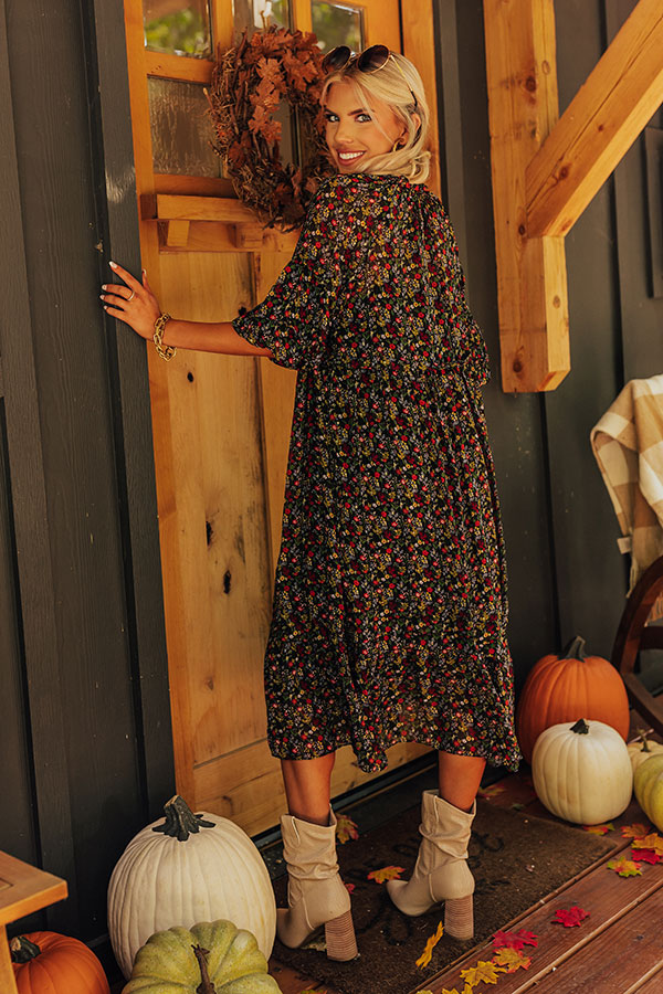 Leaves are falling and Autumn is calling! Be beautiful this season in our breezy 'Autumn Sweetheart' shift dress! Featuring black chiffon material with red, blue, yellow and hued floral pattern with a sparkle detail, black slip dress lining, ruffled crew neckline with optional tie closure, short loose sleeves, and a flowy silhouette that falls into a straight hemline.