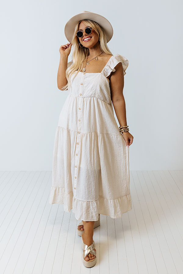 There is no better piece to pack for a Bali retreat than this pretty natural hued plus size midi dress featuring lightweight material patterned with subtle vertical stripes, a button down front with a square neckline, ruffled cap sleeves, and a relaxed skirt silhouette that falls into a ruffled mid-calf length hemline!