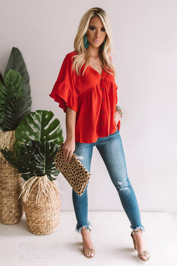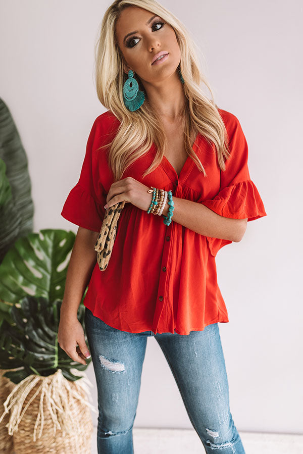 This cute babydoll top features short flutter sleeves, a v-cut back with tying details, and v-cut neckline that falls into a button down front! With a relaxed fit, this top is easy, breezy, and ready to throw on and go! Pair with a leopard clutch to add some even more flare to this red hot piece!