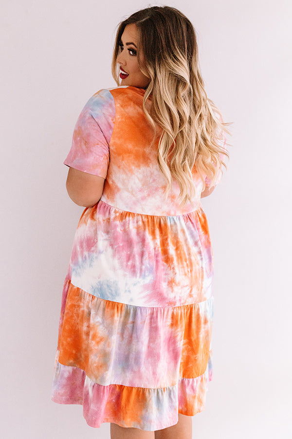 Plus Size - There is no better piece to wear in a "beach town" than this adorable dress featuring lightweight material patterned with an orange, pink, and blue tie dye print, a button up front with a v-cut neckline, short loose sleeves, and an ultra relaxed tiered babydoll silhouette that falls into an uneven ruffled knee-length hemline! We have styled this colorful piece with neutral wedges and a net bag, but you can also wear it with "The Darcy Heel in Blush" and our "Right On Cue Fringe Crossbody in White!"