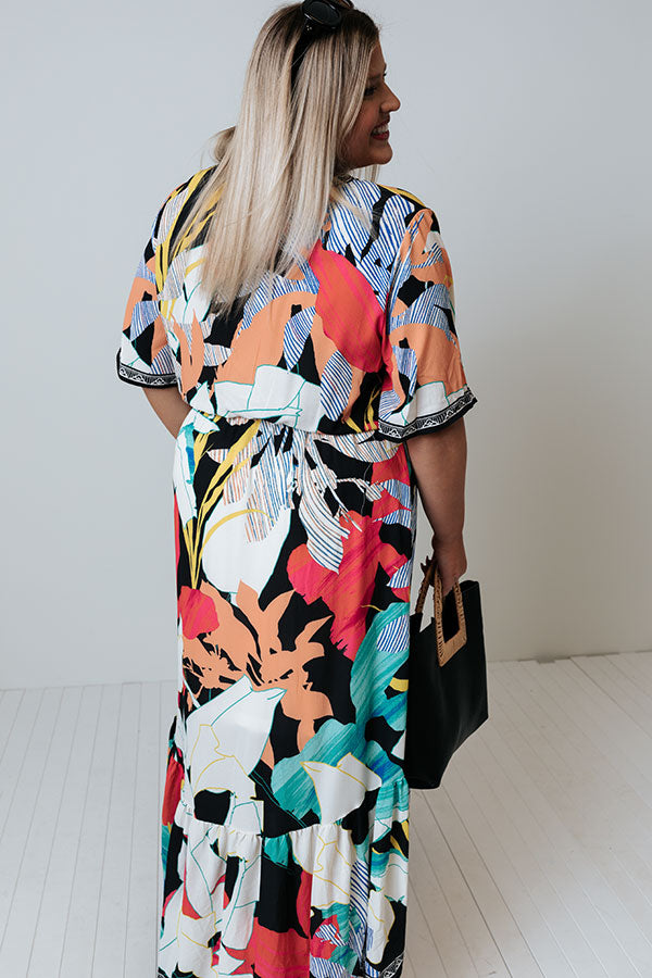 Plus Size - Sweeten up your vacay wardrobe with our eye-catching 'Bermuda Honey Maxi' dress featuring lightweight flowy material patterned with an abstract and colorful tropical print, a faux wrap bodice with a v-cut neckline, short loose sleeves, a cinched waistline with a side tie detail, and a relaxed skirt silhouette that cascades into an uneven ankle-length peplum hemline! Measurements