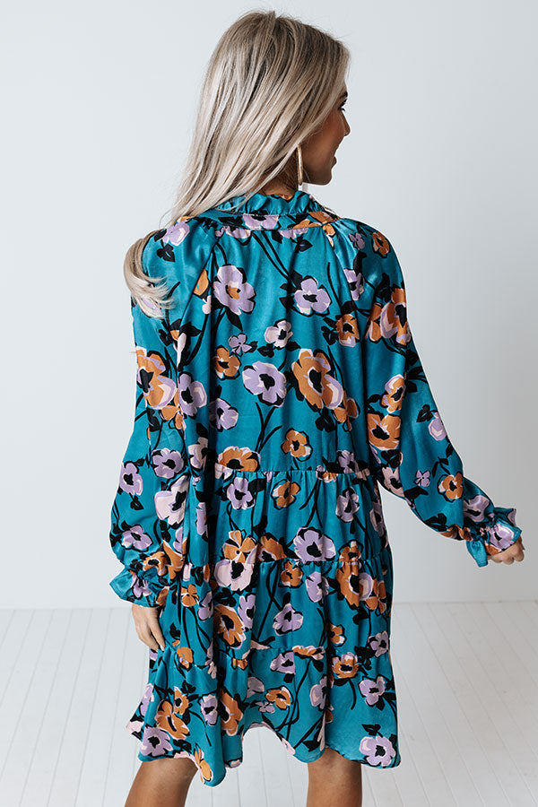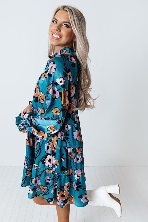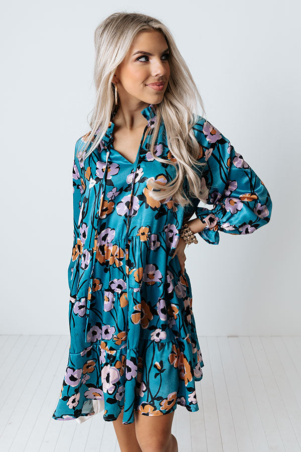 Make a vibrant entrance with our beautiful turquoise 'Cafe On Braodway' shift dress featuring lightweight material patterned with a mustard, black, and light purple floral print, a v-cut neckline with a tie closure, long loose sleeves with ruffled cuffs, and a relaxed silhouette that falls into a straight mid-thigh length hemline!