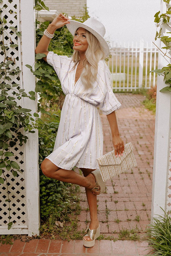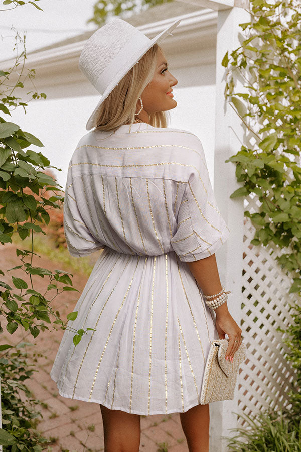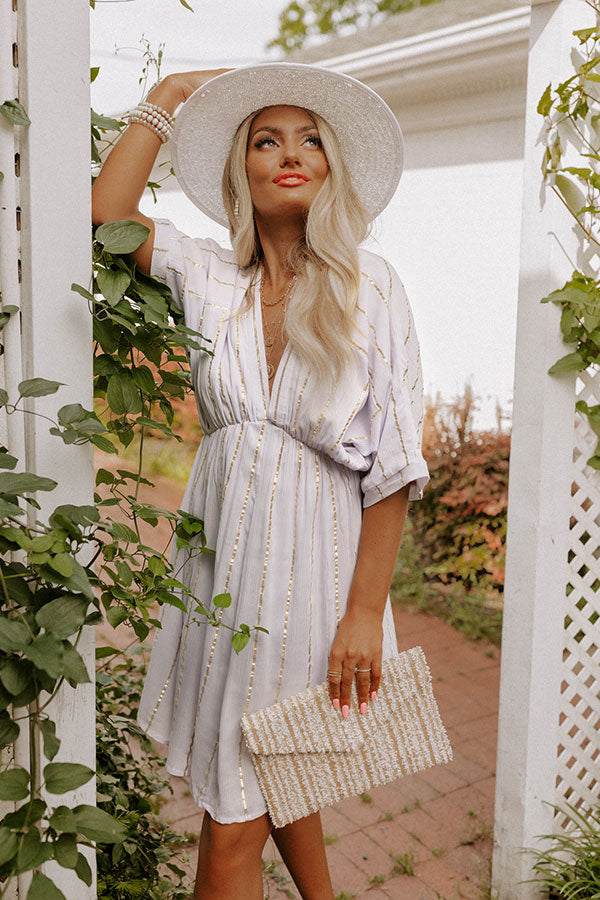 The perfect summer dress, our light lavender hued 'Calmer Waters Dress' features lightweight breezy material patterned with horizontal gold stripes, a deep v-cut neckline, loose half sleeves, a cinched waistline, and a relaxed skirt silhouette that falls into a straight mid-thigh length hemline!