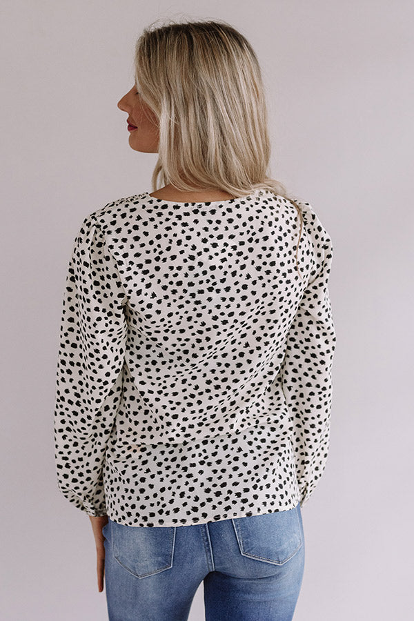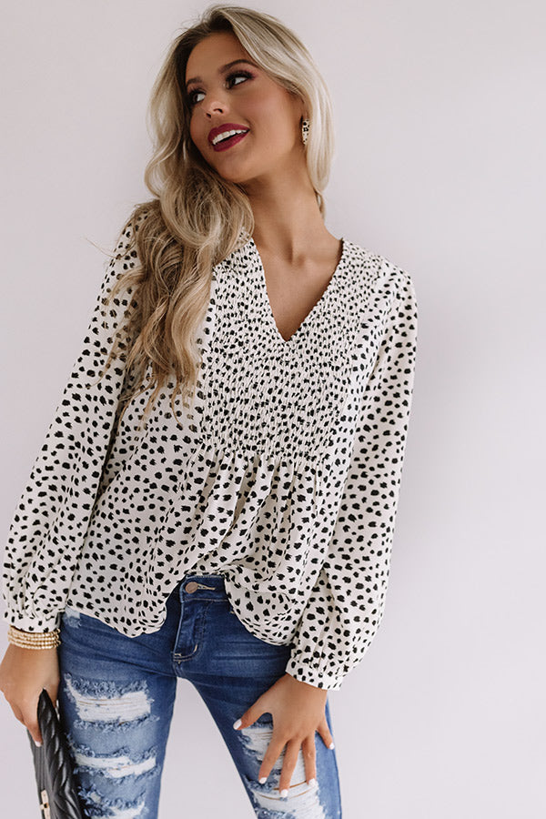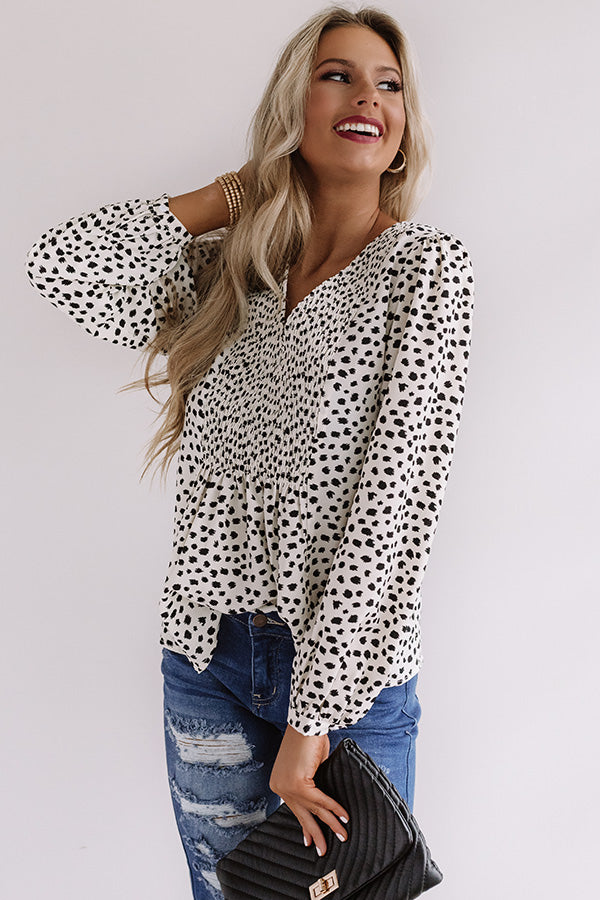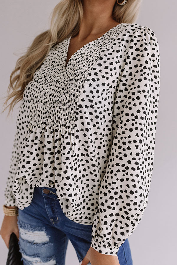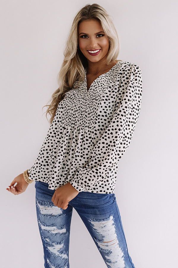 You will undoubtedly take the "center spotlight" when you wear this adorable white shift top featuring ultra lightweight material patterned with a spotted black leopard print, a v-cut neckline with subtle smocked detailing, long loose sleeves with fitted cuffs, and a relaxed silhouette that falls into a straight hemline! We have styled this cutie with some distressed ankle skinnies and a black clutch, but you can also wear it with "The Asher High Waist Shorts in Black," our "Touch Of Whimsy Hat in Dark Taupe," and "The Brighton Espadrille in Tan!" Measurements