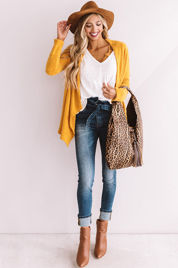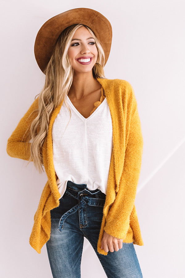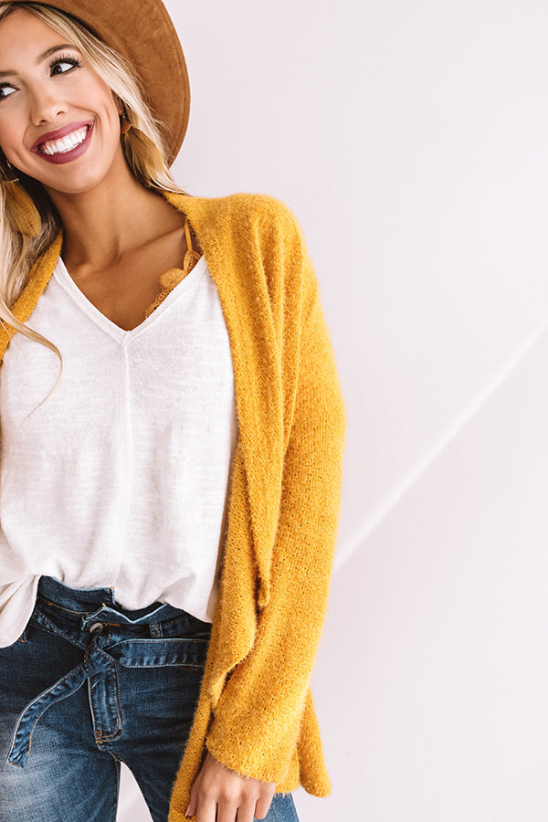Stay warm this fall with our golden honey colored "Central Park Sway" cardigan featuring soft lightweight tight knit material with fuzzy texturing, long semi-loose sleeves, and an ultra draped open front silhouette that falls into a straight tunic length hemline! You can style this versatile piece with just about anything from a basic tank to a sweater, jeans to skirts or dresses, booties to wedges or sandals, clutches to totes, and hats to earrings! Measurements