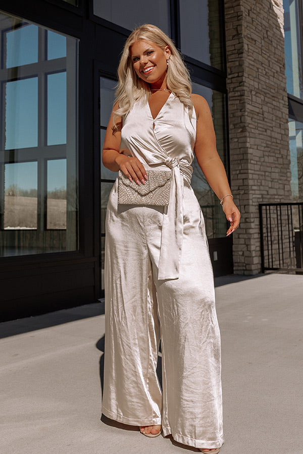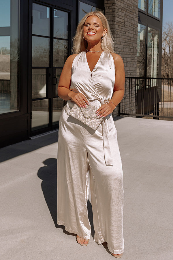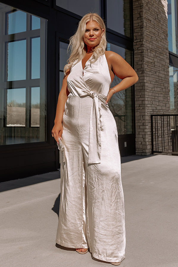 Step out in style in our glamorous plus size 'Champagne Hangout Jumpsuit' featuring lightweight satin material, a wrap bodice with a side tie closure, wide shoulder straps that tie in the back and form a v-cut neckline, and a relaxed but flattering silhouette that ends in straight ankle-length hemlines!