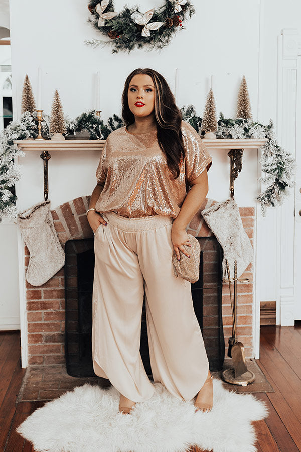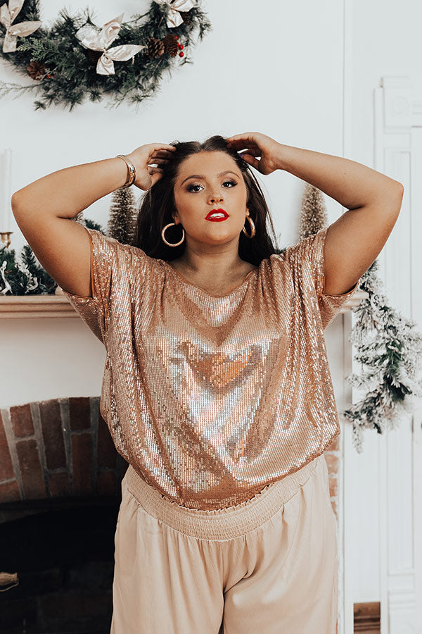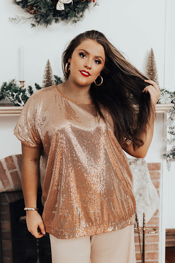 Plus Size - Leave a little sparkle wherever you go in this chic shift top featuring sleek lightweight material covered in shimmering camel colored sequins, a high rounded neckline, short loos sleeves with cinched up cuffs, and a relaxed silhouette that falls into a straight hemline!