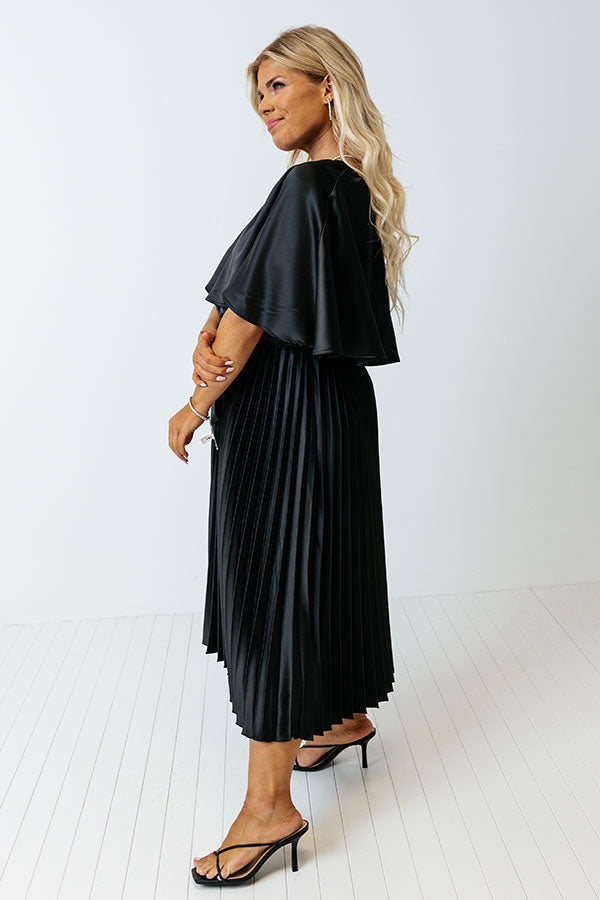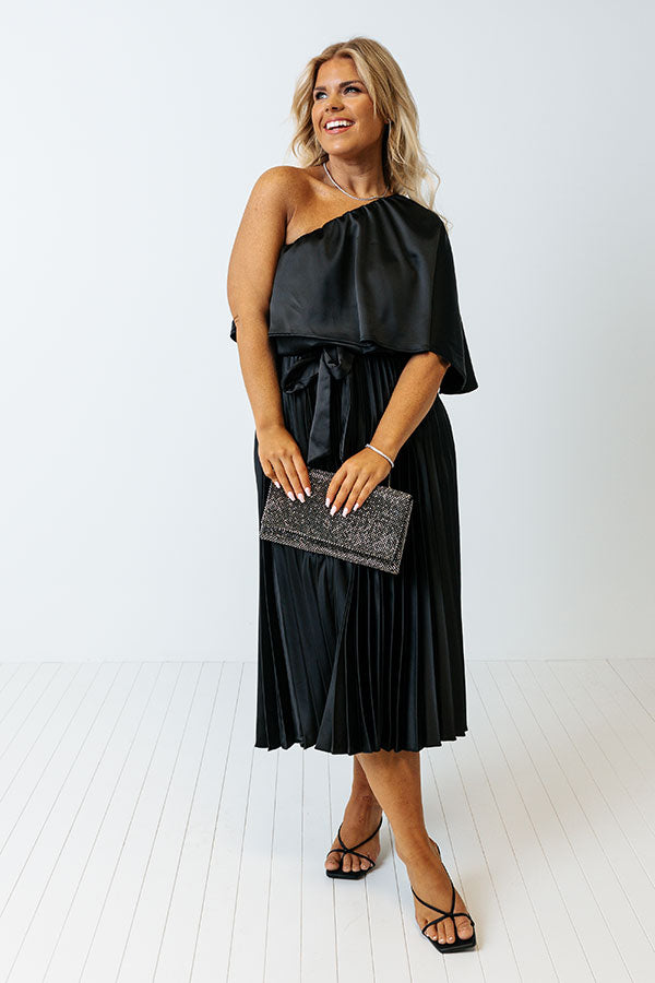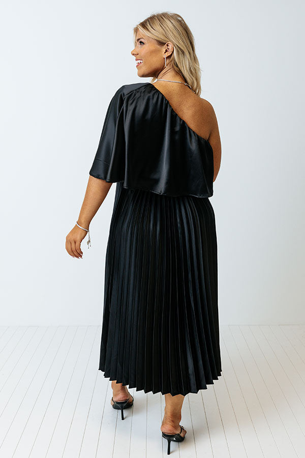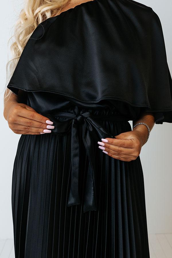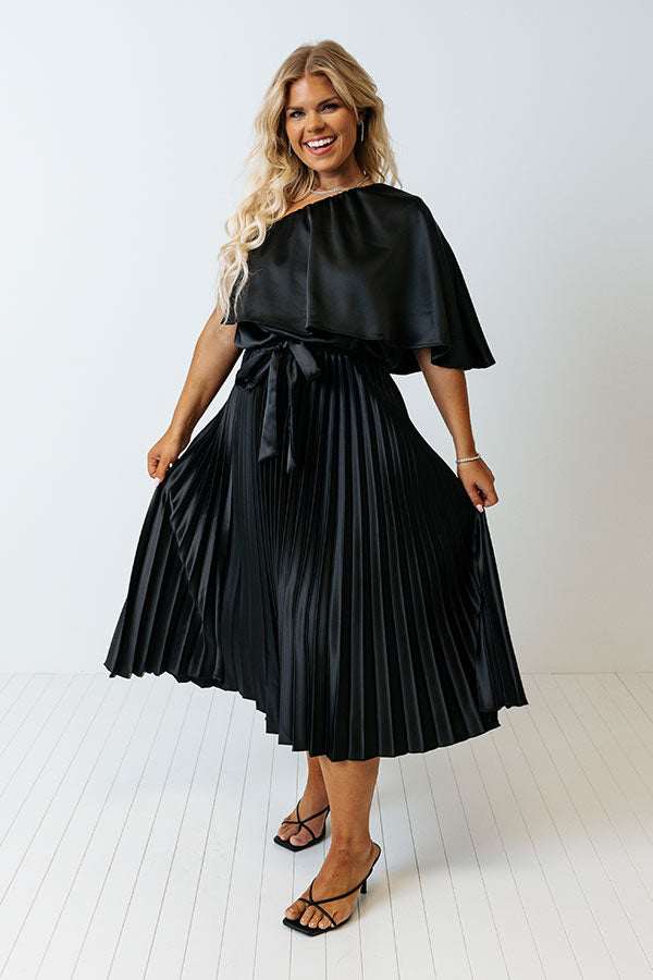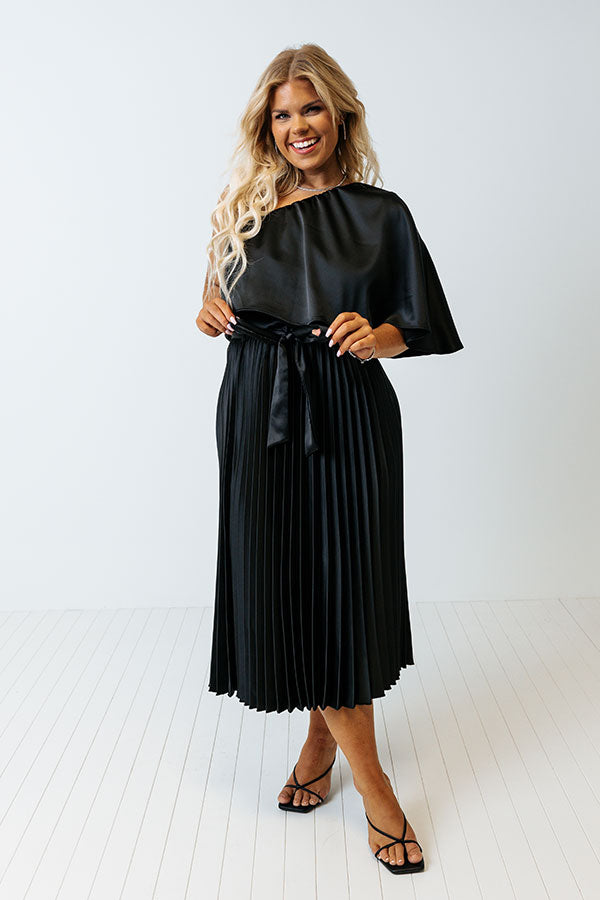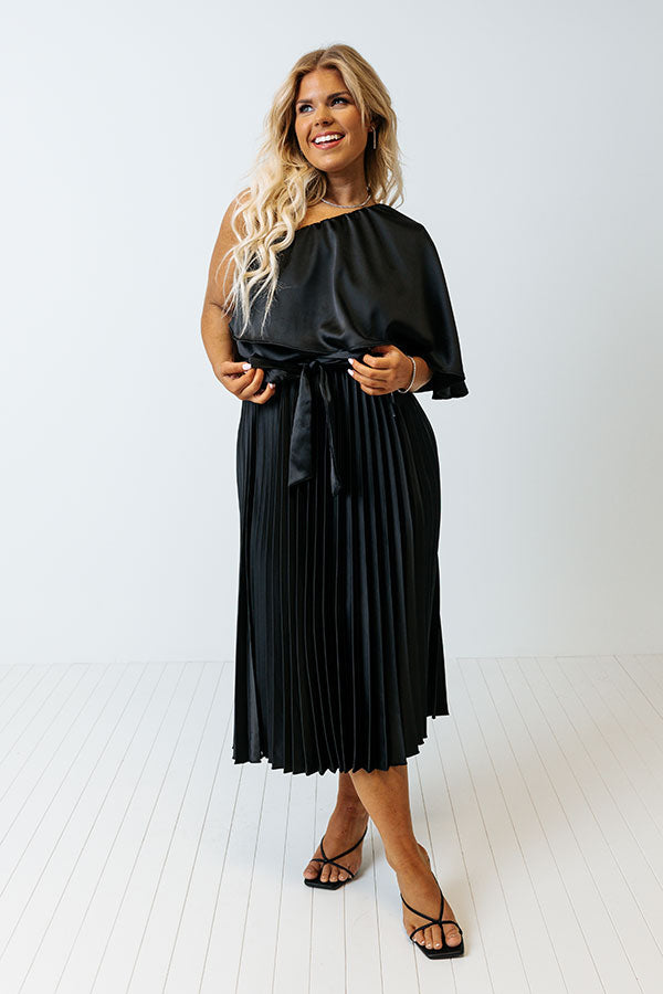 You are guaranteed to look chic and exquisite in this stunning black plus size midi dress featuring lightweight satin material, a diagonal neckline with a single loose half sleeve, a cinched waistline with a tie belt closure, and a relaxed pleated skirt that falls into a straight mid-calf length hemline!