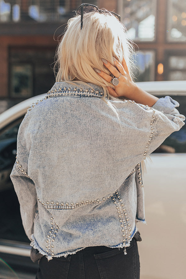 Add an edgy flair to any look with our trendy 'Chic Destruction Denim Jacket' featuring lightweight acid wash material with subtle silver stud accents, distressed detailing, long loose sleeves with button closure cuffs, two accent chest pockets with flap closure, a button down front with a collared neckline, and a slouched silhouette that ends in a straight raw-cut hemline!