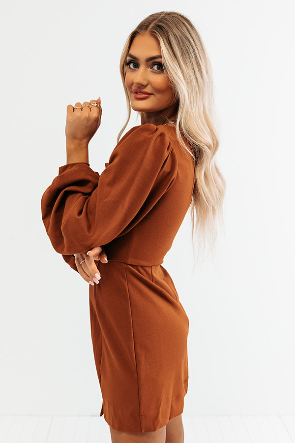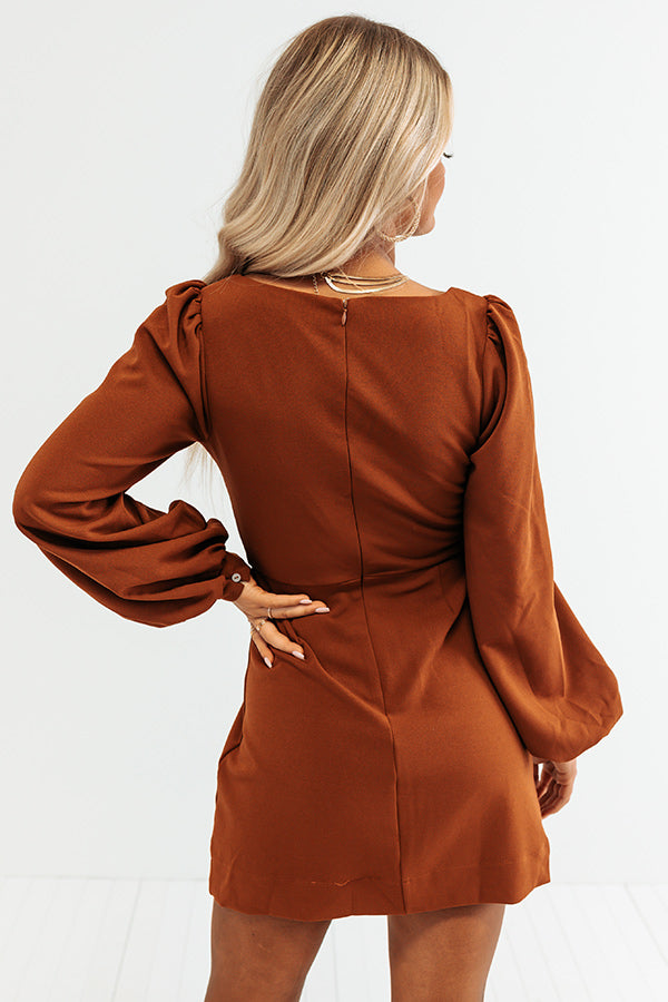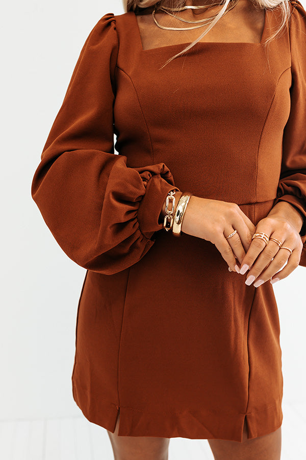 You are sure to make fashion history when you wear this chic cinnamon colored dress featuring lightweight material, a square neckline, long oversized sleeves with subtle puff shoulders and fitted cuffs, a zip closure back, and a flattering figure hugging silhouette that ends in a straight mid-thigh length hemline! Measurements