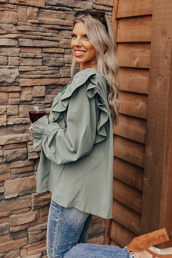Step into fall in style with our pretty pear colored 'Coming In First Place Shift Top' featuring lightweight material, a v-cut neckline with pleated detailing, long loose sleeves with oversized ruffle detailing, a keyhole accented upper back with a button closure, and a relaxed silhouette that ends in a straight hemline!