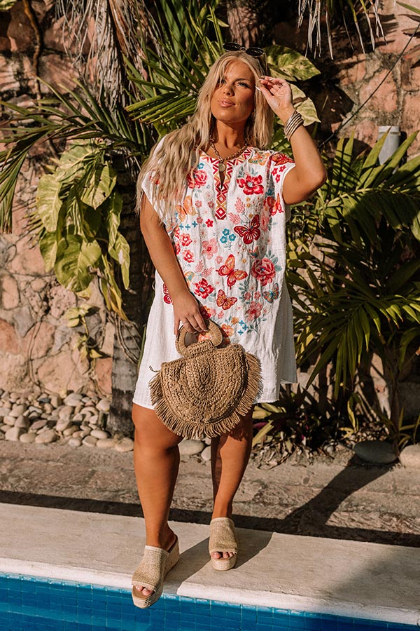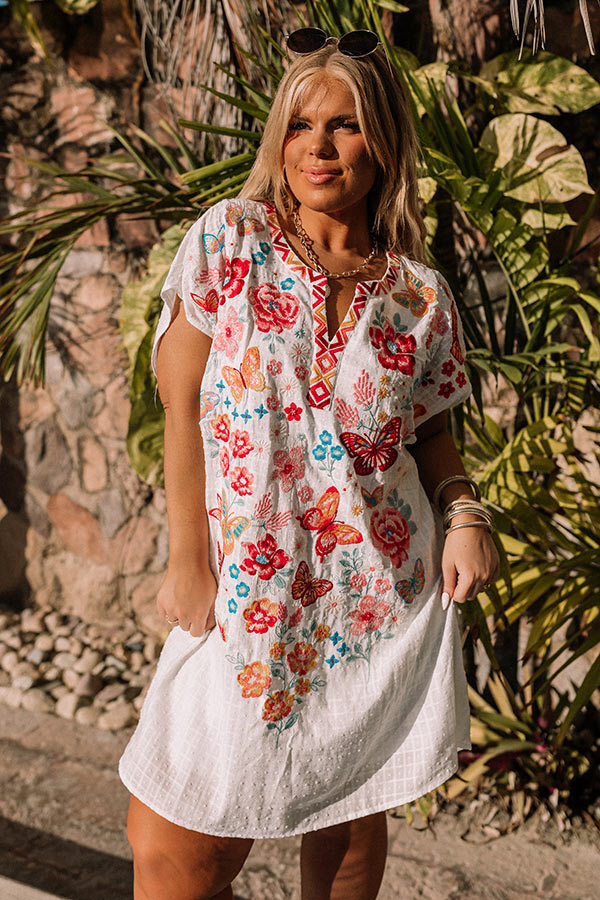 - Fully lined, lightweight white colored material with a colorful embroidered floral and butterfly design
