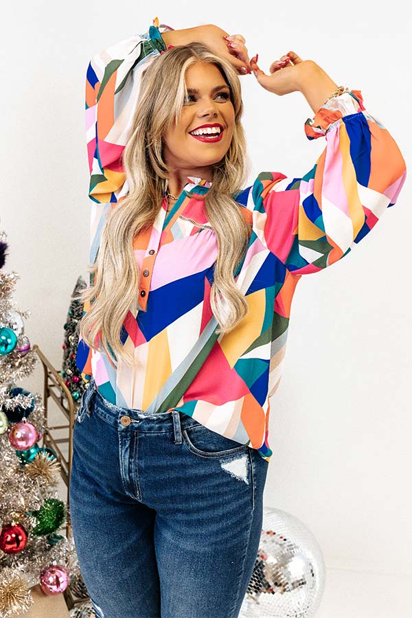 Life's a party, so dress like it in our vibrant plus size 'Day Cafe Shift Top' featuring lightweight material patterned with a geometric pink, blue, green, yellow, and orange print, a button up bodice with a rounded neckline, long loose sleeves with elastic cuffs, and a relaxed silhouette that falls into a rounded hemline! Due to manufacturing there may be variations in color pattern, no two are alike.